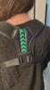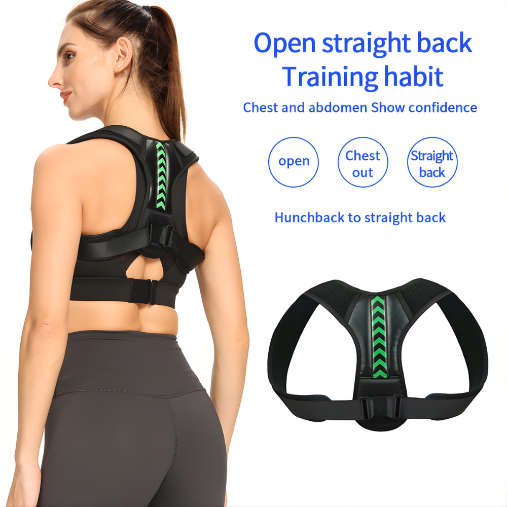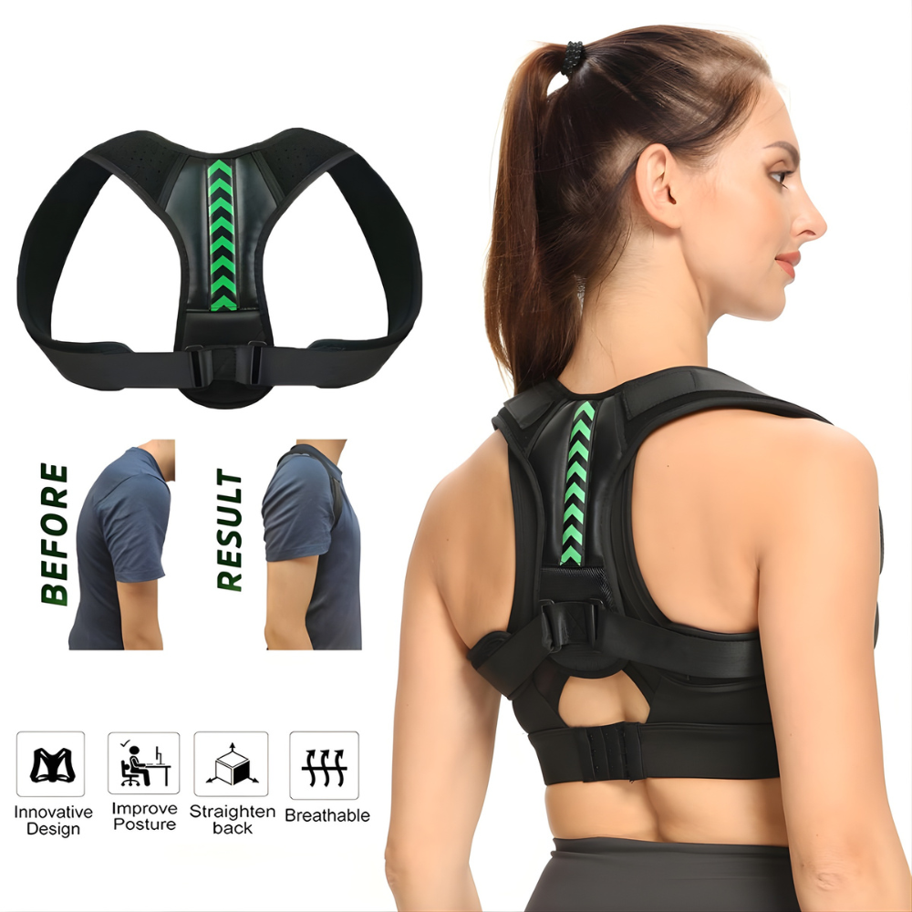 Design: Ergonomic V-shaped back brace with reflective green alignment strip and adjustable straps for a perfect fit.