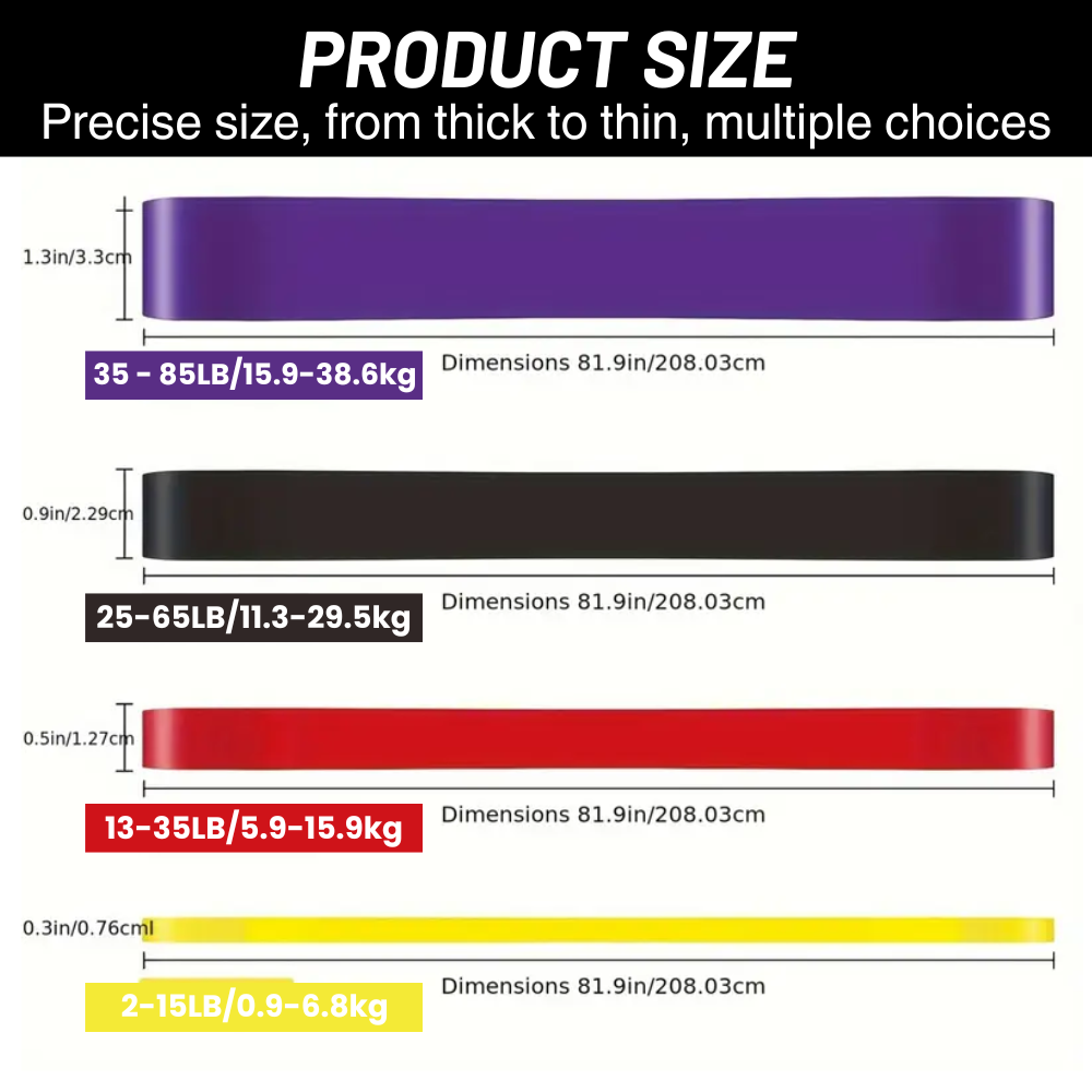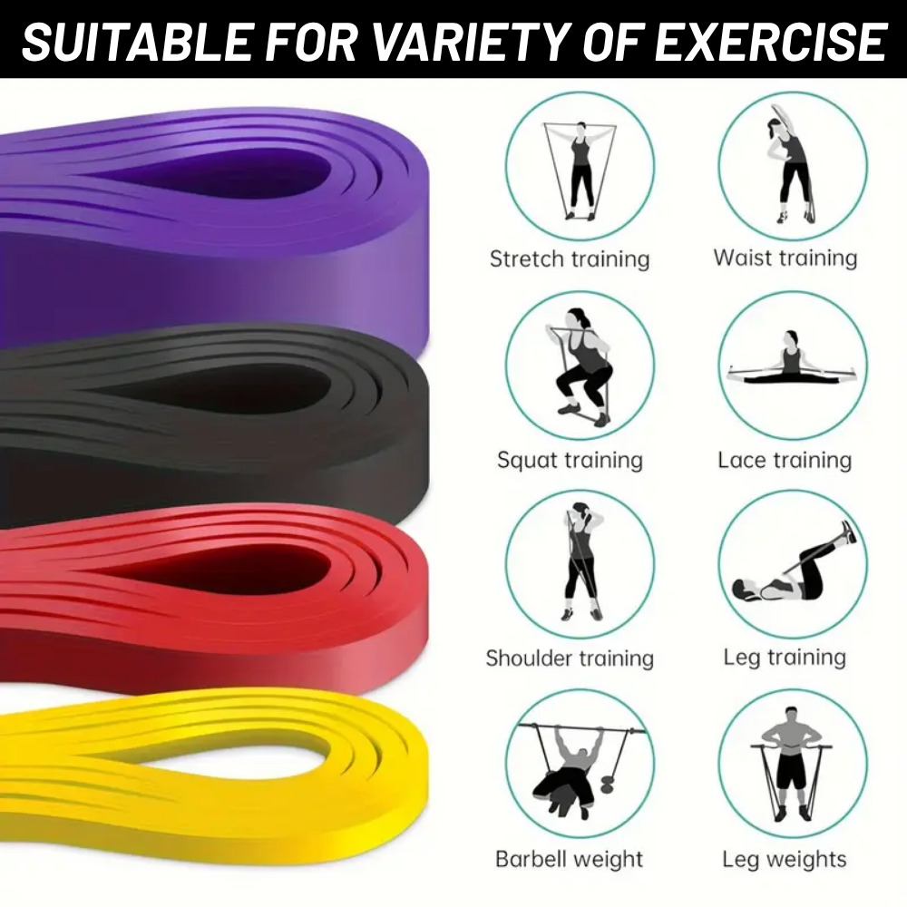 4 Premium Loop Resistance Bands (Purple, Black, Red, Yellow) — each with a different tension level
