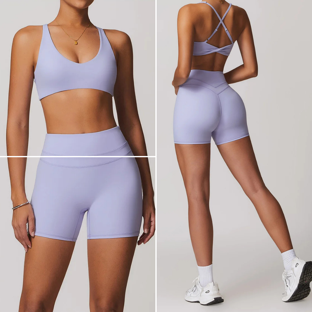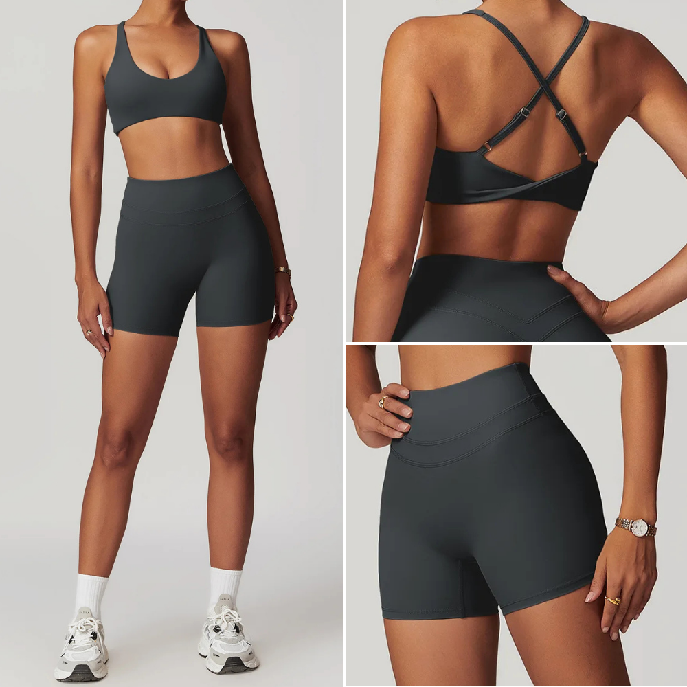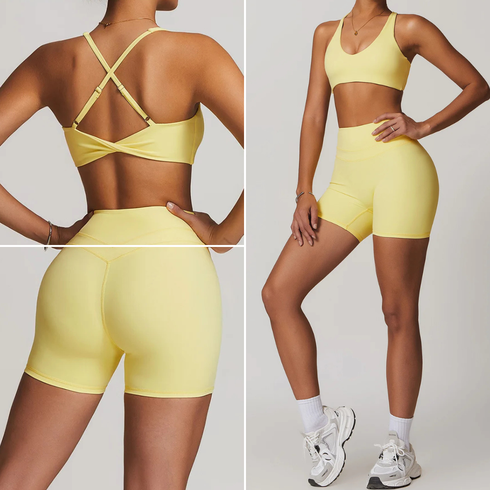 Our women’s gym set is crafted from a high-quality blend of nylon and spandex. This fabric is lightweight, breathable, sweat-wicking, and offers 4-way stretch for maximum comfort and flexibility.